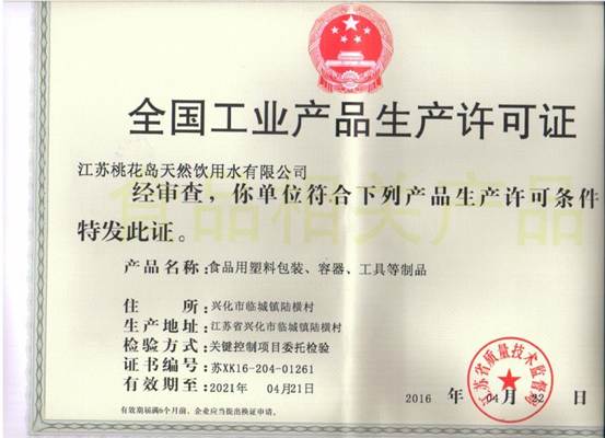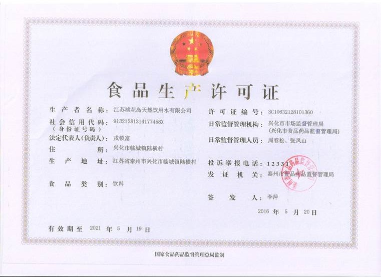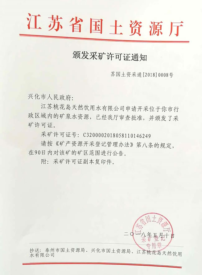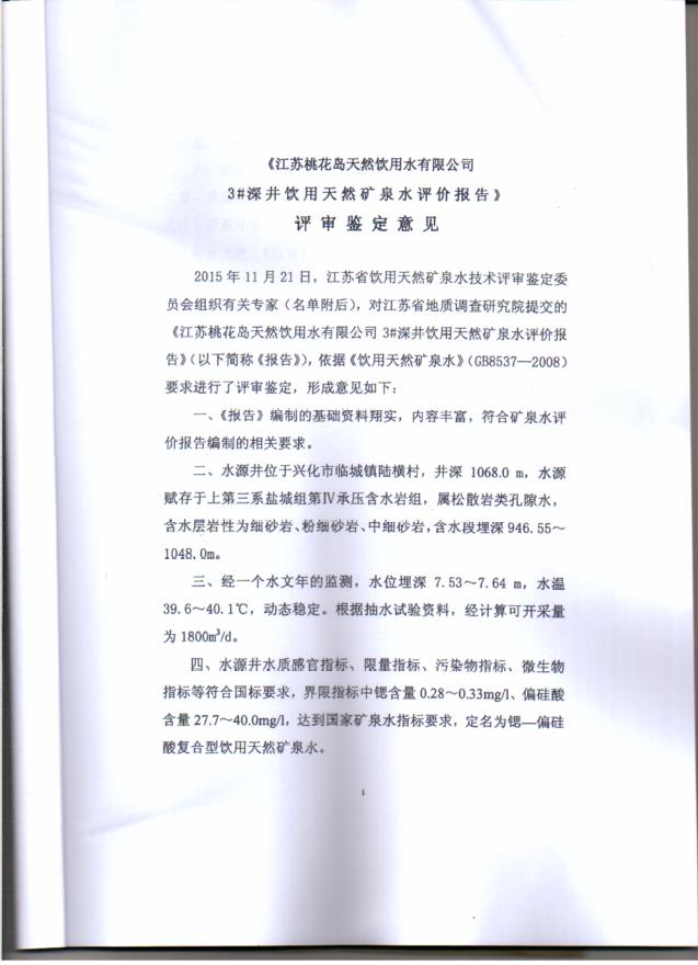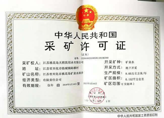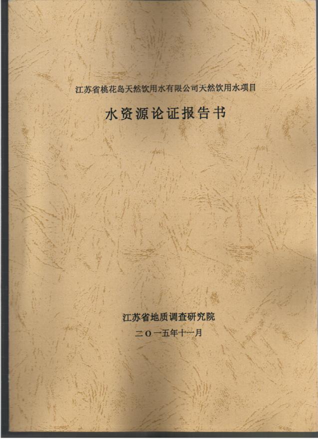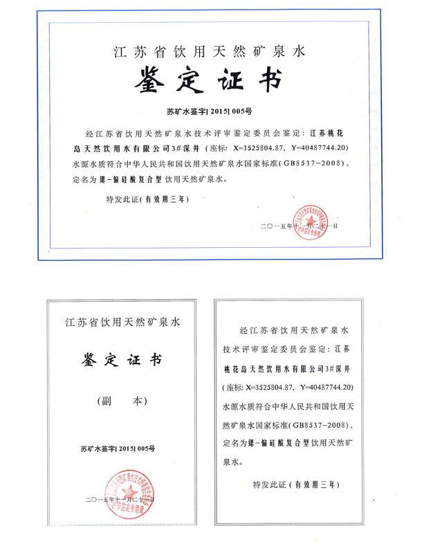 天然桃花泉2015年通过水文地质工程地质勘察中心、江苏省地质调查研究院等相关权威部门的认定,并颁发了江苏省饮用天然矿泉水鉴定证书。
