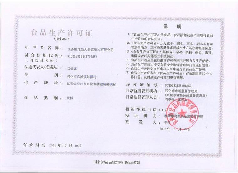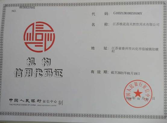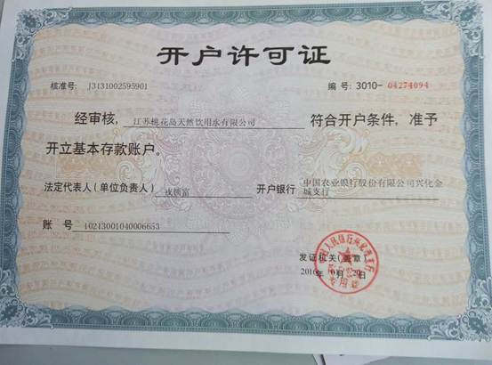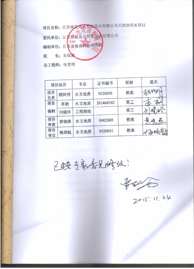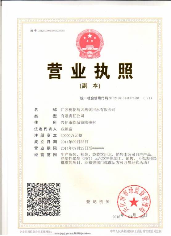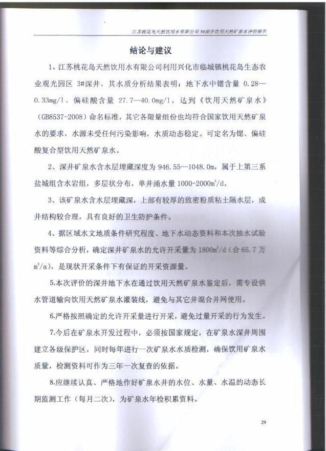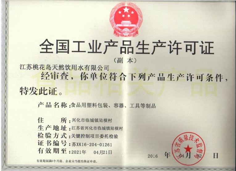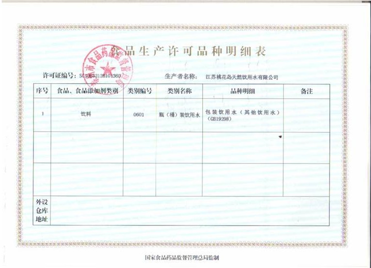 天然桃花泉2015年通过水文地质工程地质勘察中心、江苏省地质调查研究院等相关权威部门的认定,并颁发了江苏省饮用天然矿泉水鉴定证书。